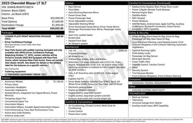 This Chevrolet Blazer has great equipment and many features including, 170 Amp Alternator, Apple CarPlay/Android Auto, Auto High-beam Headlights, Auto-dimming door mirrors, Auto-dimming Rear-View mirror, Brake assist, Compass, Delay-off headlights, Driver Confidence Package, Driver vanity mirror, Electronic Stability Control, Fully automatic headlights, Heated door mirrors, Lane Change Alert w/Side Blind Zone Alert, Outside Heated Power-Adjustable Body-Color Mirrors, Panic alarm, Power door mirrors, Rear Cross Traffic Alert, Rear Park Assist w/Audible Warning, Security system, Speed control, Spoiler, Turn signal indicator mirrors.Black 2023 Chevrolet Blazer LT AWD 4D Sport Utility 3.6L V6 SIDI 19/26 City/Highway MPG Certified.Chevrolet Certified Pre-Owned Details:* Limited Warranty: 12 Month/12,000 Mile (whichever comes first) from certified purchase date* Warranty Deductible: $0* Roadside Assistance* Powertrain Limited Warranty: 72 Month/100,000 Mile (whichever comes first) from original in-service date* 172 Point Inspection* Vehicle History* Transferable Warranty* 24 months/24,000 miles (whichever comes first) Certified Pre-Owned Scheduled Maintenance Plan and 3 days/150 miles (whichever comes first) Vehicle Exchange Program. SiriusXM 3-month trial subscription.Come see why more people choose our Community!