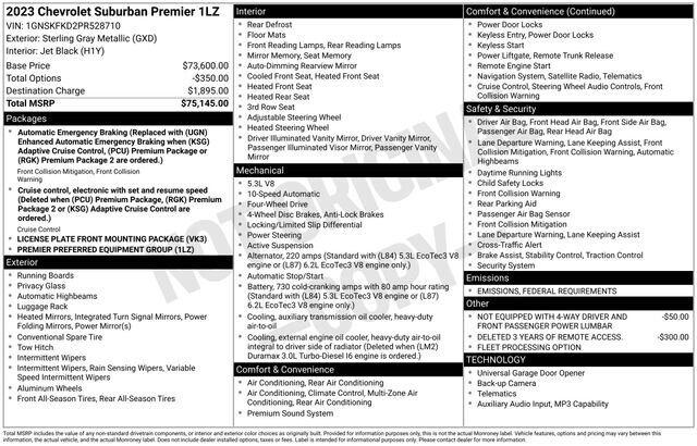 This Chevrolet Suburban has great equipment and many features including, 1st & 2nd Row Color-Keyed Carpeted Floor Mats, 2-Speed Active Electronic AutoTrac Transfer Case, 3rd Row 60/40 Power-Folding Split-Bench, Air Conditioning, Auto-Dimming Inside Rear-View Mirror, Bose 10-Speaker Surround w/CenterPoint, Bright Front & Rear Door Sill Plates, Chrome Door Handles w/Body-Color Strip, Chrome Mirror Caps, Color-Keyed Carpeting Floor Covering, Driver & Front Outboard Passenger Airbags, Dual Exhaust System, Enhanced Driver Information Center, Floor Console, Hands-Free Rear Power Programmable Liftgate, Heated & Ventilated Driver & Front Passenger Seats, Heated 2nd Row Outboard Seats, Heated Driver & Front Passenger Seats, Heated Steering Wheel, Hill Descent Control, Infotainment Display, Lane Change Alert w/Side Blind Zone Alert, LED Daytime Running Lamps, Memory Settings, Outside Heated Power-Adjustable Mirrors, Power Release 2nd Row Bucket Seats, Power Tilt & Telescopic Steering Column, Preferred Equipment Group 1LZ, Rear Cross Traffic Alert, Remote Start, Safety Alert Seat, SiriusXM Radio w/360L, Universal Home Remote, Wireless Charging, Wrapped Steering Wheel.Sterling Gray Metallic 2023 Chevrolet Suburban Premier 4WD 4D Sport Utility EcoTec3 5.3L V8 Certified.Chevrolet Certified Pre-Owned Details:* Transferable Warranty* Powertrain Limited Warranty: 72 Month/100,000 Mile (whichever comes first) from original in-service date* 172 Point Inspection* Roadside Assistance* Vehicle History* Warranty Deductible: $0* Limited Warranty: 12 Month/12,000 Mile (whichever comes first) from certified purchase date* 24 months/24,000 miles (whichever comes first) Certified Pre-Owned Scheduled Maintenance Plan and 3 days/150 miles (whichever comes first) Vehicle Exchange Program. SiriusXM 3-month trial subscription.Come see why more people choose our Community!