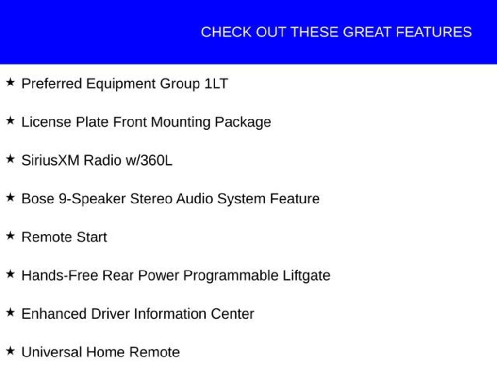 This Chevrolet Suburban has great equipment and many features including, 10-Way Power Driver & Passenger Seat Adjusters, 1st & 2nd Row Color-Keyed Carpeted Floor Mats, Auto-Dimming Inside Rear-View Mirror, Bose 9-Speaker Stereo Audio System Feature, Bright Front & Rear Door Sill Plates, Color-Keyed Carpeting Floor Covering, Driver & Front Outboard Passenger Airbags, Enhanced Driver Information Center, Floor Console w/Storage Area, Hands-Free Rear Power Programmable Liftgate, Heated Driver & Front Passenger Seats, Infotainment Display, LED Daytime Running Lamps, License Plate Front Mounting Package, Memory Settings For Driver, Preferred Equipment Group 1LT, Remote Start, SiriusXM Radio w/360L, Universal Home Remote, Wireless Charging, Wrapped Steering Wheel.