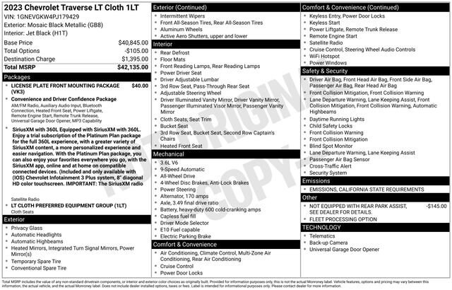 This Chevrolet Traverse has great equipment and many features including, Heated Seats, Apple CarPlay, 8-Way Power Driver Seat Adjuster, Air Conditioning, Automatic temperature control, Front License Plate Bracket Mounting Package, Garage door transmitter, Heated Driver & Front Passenger Seats, Illuminated entry, Leather steering wheel, Power Liftgate, Preferred Equipment Group 1LT.Mosaic Black Metallic 2023 Chevrolet Traverse LT 1LT AWD 4D Sport Utility 3.6L V6 SIDI VVT Certified.Chevrolet Certified Pre-Owned Details:* Powertrain Limited Warranty: 72 Month/100,000 Mile (whichever comes first) from original in-service date* Vehicle History* Warranty Deductible: $0* 172 Point Inspection* Limited Warranty: 12 Month/12,000 Mile (whichever comes first) from certified purchase date* Transferable Warranty* Roadside Assistance* 24 months/24,000 miles (whichever comes first) Certified Pre-Owned Scheduled Maintenance Plan and 3 days/150 miles (whichever comes first) Vehicle Exchange Program. SiriusXM 3-month trial subscription.Come see why more people choose our Community!