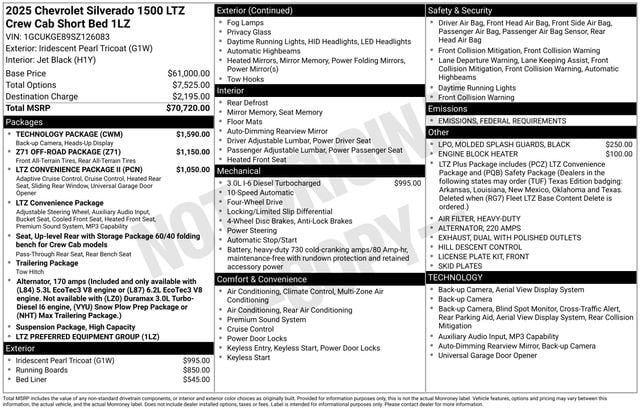 This Chevrolet Silverado 1500 has great equipment and many features including, 10-Way Power Driver Seat w/Lumbar, 10-Way Power Passenger Seat Adjuster w/Lumbar, 12.3 Multicolor Reconfigurable Digital Display, 120-Volt Interior Power Outlet, 15 Diagonal Multicolor Head-Up Display, 2nd Row Heated Outboard Seats, Adaptive Cruise Control, Auto-Dimming Inside Rear-View Mirror, Auto-Locking Rear Differential, Bed View Camera, Bluetooth® For Phone, Chrome Mirror Caps, Color-Keyed Carpeting Floor Covering, Deep-Tinted Glass, Driver Memory, Dual Exhaust w/Black Exhaust Tips, Dual Rear USB Ports (Charge Only), Electric Rear-Window Defogger, Electronic Cruise Control, Front Frame-Mounted Black Recovery Hooks, Front LED Fog Lamps, Front Rain-Sensing Wipers, Front Rubberized Vinyl Floor Mats, Heated Driver & Front Outboard Passenger Seats, Heated Steering Wheel, Heavy-Duty Air Filter, High Capacity Suspension Package, Hill Descent Control, Hitch Guidance w/Hitch View, In-Vehicle Trailering System App, Integrated Trailer Brake Controller, Keyless Open & Start, LED Cargo Area Lighting, LTZ Convenience Package, LTZ Convenience Package II, LTZ Plus Package, Off-Road Suspension, OnStar Services Capable, Outside Heated Power-Adjustable Mirrors, Power Front Passenger Windows w/Express Up/Down, Power Front Windows w/Driver Express Up/Down, Power Rear Windows w/Express Down, Power Sliding Rear Window w/Rear Defogger, Power Tailgate, Preferred Equipment Group 1LZ, Rear Camera Mirror, Rear Rubberized-Vinyl Floor Mats, Rear Wheelhouse Liners, Remote Vehicle Starter System, Safety Package, SiriusXM w/360L Trial Subscription, Standard Tailgate, Steering Wheel Audio Controls, Technology Package, Teen Driver, Theft Deterrent System (Unauthorized Entry), Tire Pressure Monitoring System, Trailering Package, Universal Home Remote, Up-Level Rear Seat w/Storage Package, Wrapped Steering Wheel, Z71 Off-Road Package.