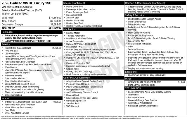 2026 Cadillac VISTIQ Luxury AWD 1-Speed Automatic Electric Motor Radiant Red Tintcoat This Cadillac VISTIQ has great equipment and many features including.
