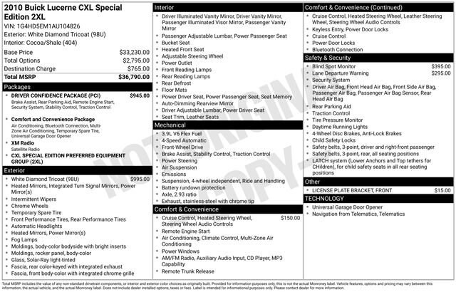 This Buick Lucerne has great equipment and many features including.White Diamond Tricoat 2010 Buick Lucerne CXL Special Edition FWD 4D Sedan 3.9L V6 SFI Flex Fuel 17/26 City/Highway MPGCome see why more people choose our Community!