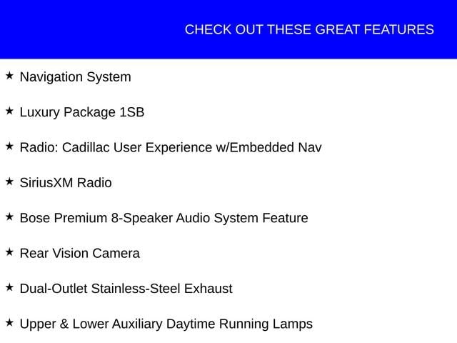 This Cadillac XTS has great equipment and many features including, Bose Premium 8-Speaker Audio System Feature, Dual-Outlet Stainless-Steel Exhaust, Leather-Wrapped Steering Wheel, Luxury Package 1SB, Navigation System, Radio: Cadillac User Experience w/Embedded Nav, Rear Vision Camera, SiriusXM Radio, Upper & Lower Auxiliary Daytime Running Lamps.