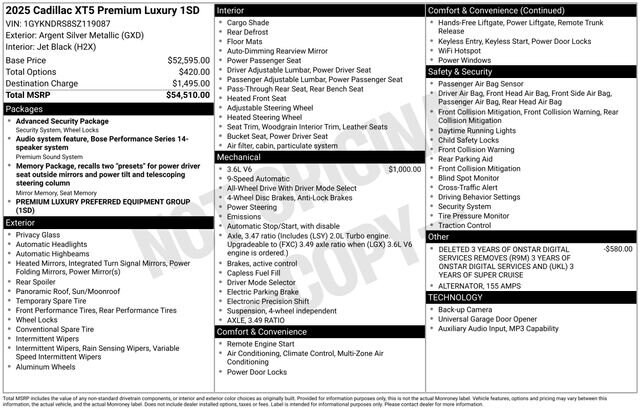This Cadillac XT5 has great equipment and many features including.Argent Silver Metallic 2025 Cadillac XT5 Premium Luxury AWD 4D Sport Utility 3.6L V6 DI VVT 18/26 City/Highway MPGCome see why more people choose our Community!