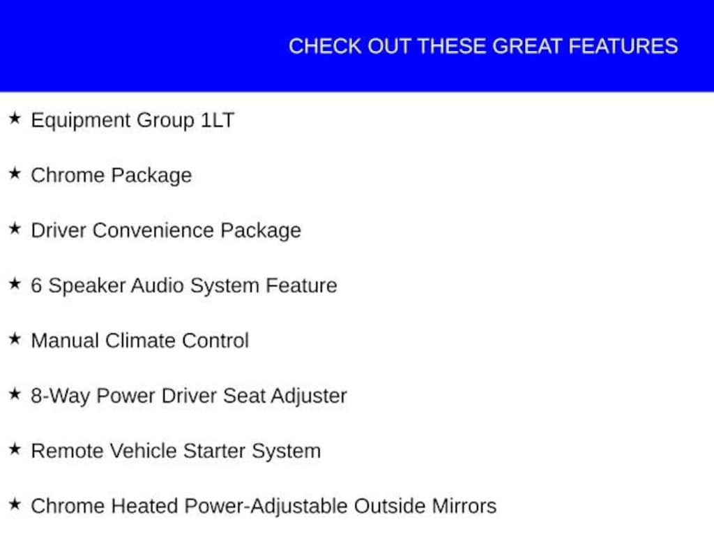 This Chevrolet Equinox has great equipment and many features including, 18 Chrome-Clad Aluminum Wheels, 6 Speaker Audio System Feature, 8-Way Power Driver Seat Adjuster, Black All-Weather Rear Cargo Mat (LPO), Chrome Heated Power-Adjustable Outside Mirrors, Chrome Package, Driver Convenience Package, Equipment Group 1LT, Manual Climate Control, Remote Vehicle Starter System.