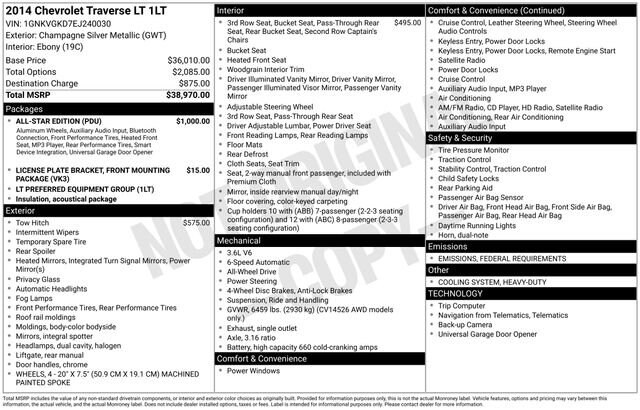 This Chevrolet Traverse has great equipment and many features including, 20 x 7.5 Machined Painted Spoke Wheels, 4-Wheel Disc Brakes, 8-Way Power Driver Seat w/Power Lumbar, ABS brakes, All-Star Edition, Bluetooth® For Phone, Body-Color Bodyside Moldings, Body-Color Heated Power-Adjustable Outside Mirrors, CD player, Enhanced Driver Information Center, Front Fog Lamps, Front License Plate Bracket Mounting Package, Front reading lights, Front Row Side-Impact Air Bags, Heated door mirrors, Heated Driver & Front Passenger Seats, Heavy-Duty Cooling System, Interior Wood Grain Center Stack & Interior Trim, Leather-Wrapped Steering Wheel, Overhead airbag, Power door mirrors, Preferred Equipment Group 1LT, Premium Cloth Seat Trim, Radio: Chevrolet MyLink, Rear anti-roll bar, Rear Park Assist, Remote Vehicle Start, Single-Zone Manual Front Climate Control, Standard Speaker System, Trailer Hitch, Trailering Equipment, Universal Home Remote, Variable Effort Power Steering.