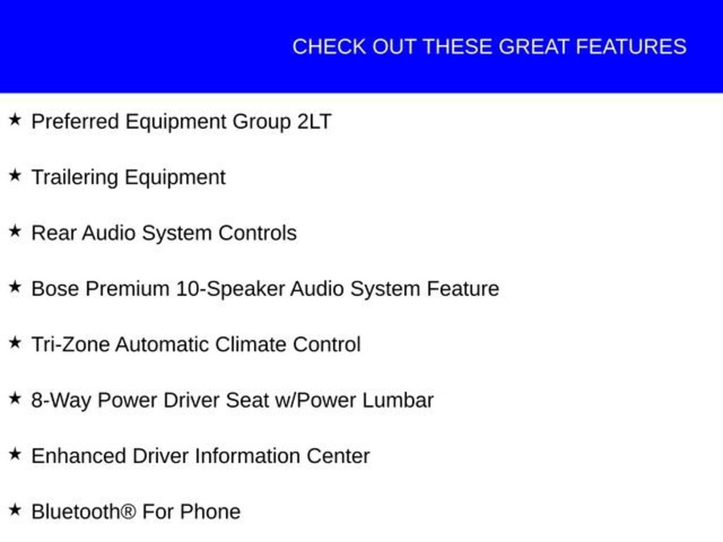 This Chevrolet Traverse has great equipment and many features including, 8-Way Power Driver Seat w/Power Lumbar, Auto-Dimming Inside Rear-View Mirror, Bluetooth® For Phone, Body-Color Bodyside Moldings, Bose Premium 10-Speaker Audio System Feature, Enhanced Driver Information Center, Front Fog Lamps, Front Row Side-Impact Air Bags, Heated Driver & Front Passenger Seats, Heated Power-Adjustable Body-Color Outside Mirrors, Heavy-Duty Cooling System, Interior Wood Grain Center Stack & Interior Trim, Leather-Wrapped Steering Wheel, Preferred Equipment Group 2LT, Rear Audio System Controls, Rear Park Assist, Rear Power Liftgate, Remote Vehicle Start, Trailer Hitch, Trailering Equipment, Tri-Zone Automatic Climate Control, Universal Home Remote.
