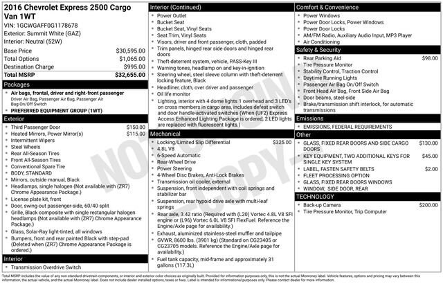 This Chevrolet Express 2500 has great equipment and many features including, 4-Wheel Disc Brakes, ABS brakes, Black Heated Power-Adjustable Outside Mirrors, Delay-off headlights, Driver door bin, Dual front impact airbags, Electronic Stability Control, Front wheel independent suspension, Fully automatic headlights, Heavy-Duty Rear Locking Differential, Inside Rearview Mirror w/Rr Vision Camera Display, Low tire pressure warning, Passenger cancellable airbag, Preferred Equipment Group 1WT, Rear Vision Camera, Sliding Passenger-Side Door.
