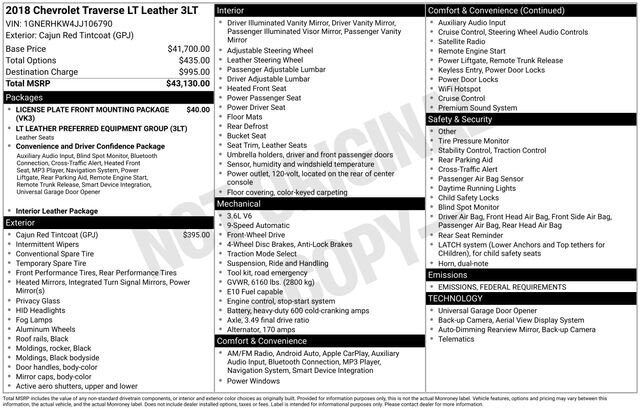 Cajun Red Tintcoat 2018 Chevrolet Traverse 3LT FWD 4D Sport Utility 3.6L V6 SIDI VVT 18/27 City/Highway MPG