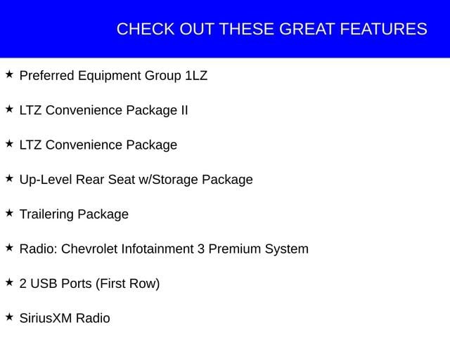 This Chevrolet Silverado 1500 has great equipment and many features including, 10-Way Power Driver Seat w/Lumbar, 10-Way Power Passenger Seat Adjuster w/Lumbar, 12-Volt Rear Auxiliary Power Outlet, 120-Volt Bed Mounted Power Outlet, 120-Volt Instrument Panel Power Outlet, 170 Amp Alternator, 2 USB Ports (First Row), 2nd Row Heated Outboard Seats, 4.2 Diagonal Color Display Driver Info Center, 6-Speaker Audio System, Advanced Trailering System, Auto-Dimming Inside Rear-View Mirror, Auxiliary External Transmission Oil Cooler, Bluetooth® For Phone, Chevrolet Connected Access, Chevrolet w/4G LTE, Chrome Grille, Chrome Mirror Caps, Color-Keyed Carpeting Floor Covering, Compass, Deep-Tinted Glass, Driver Memory, Electric Rear-Window Defogger, Electrical Lock Control Steering Column, Electronic Cruise Control, EZ Lift Power Lock & Release Tailgate, Floor Mounted Console, Front Bucket Seats, Front Frame-Mounted Black Recovery Hooks, Front LED Fog Lamps, Front Rubberized Vinyl Floor Mats, HD Radio, HD Rear Vision Camera, Heated Driver & Front Passenger Seats, Heated Steering Wheel, Heavy-Duty Rear Locking Differential, Hitch Guidance, Hitch Guidance w/Hitch View, Integrated Trailer Brake Controller, Keyless Open & Start, Leather Wrapped Steering Wheel, LED Cargo Area Lighting, LTZ Convenience Package, LTZ Convenience Package II, Manual Tilt/Telescoping Steering Column, OnStar & Chevrolet Connected Services Capable, Outside Heated Power-Adjustable Mirrors, Power Door Locks, Power Front Passenger Windows w/Express Up/Down, Power Front Windows w/Driver Express Up/Down, Power Rear Windows w/Express Down, Power Sliding Rear Window w/Rear Defogger, Power Tailgate, Preferred Equipment Group 1LZ, Premium Bose 7-Speaker Sound System, Radio: Chevrolet Infotainment 3 Premium System, Rear Dual USB Charging-Only Ports, Rear Rubberized-Vinyl Floor Mats, Rear Wheelhouse Liners, Remote Vehicle Starter System, SiriusXM Radio, Steering Wheel Audio Controls, Theft Deterrent System (Unauthorized Entry), Trailer Tire Pressure Monitor System, Trailering Package, Universal Home Remote, Up-Level Rear Seat w/Storage Package, Ventilated Driver & Front Passenger Seats, Wireless Charging.