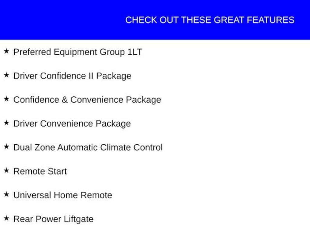 This Chevrolet Equinox has great equipment and many features including, 3-Spoke Leather-Wrapped Steering Wheel, Confidence & Convenience Package, Driver Confidence II Package, Driver Convenience Package, Dual Zone Automatic Climate Control, Front Fog Lamps, Heated Driver & Front Passenger Seats, Lane Change Alert w/Side Blind Zone Alert, Preferred Equipment Group 1LT, Rear Cross Traffic Alert, Rear Park Assist w/Audible Warning, Rear Power Liftgate, Remote Start, Universal Home Remote.