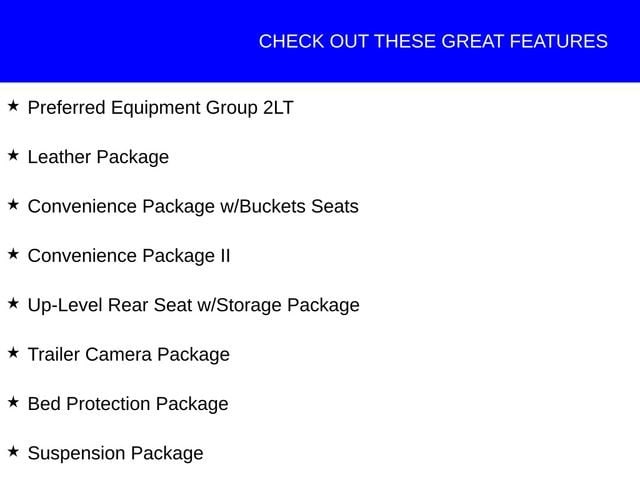 This Chevrolet Silverado 1500 has great equipment and many features including, 10-Way Power Driver Seat w/Lumbar, 12-Volt Rear Auxiliary Power Outlet, 120-Volt Instrument Panel Power Outlet, 170 Amps Alternator, 2 USB Ports, 2 USB Ports (First Row), 4-Way Manual Driver Seat Adjuster, 4.2 Diagonal Color Display Driver Info Center, 6-Speaker Audio System, Advanced Trailering Package, Advanced Trailering System, All-Weather Floor Liner (LPO) (AAK), Auxiliary External Transmission Oil Cooler, Bed Protection Package, Bed View Camera, Bluetooth® For Phone, Chevytec Spray-On Black Bedliner, Color-Keyed Carpeting Floor Covering, Compass, Convenience Package II, Convenience Package w/Buckets Seats, Deep-Tinted Glass, Dual Exhaust w/Polished Outlets, Dual-Zone Automatic Climate Control, Electric Rear-Window Defogger, Electrical Lock Control Steering Column, Floor Mounted Center Console, Front Bucket Seats, Front LED Fog Lamps, HD Radio, HD Rear Vision Camera, Heated Driver & Front Outboard Passenger Seats, Heated Steering Wheel, Heavy-Duty Rear Locking Differential, High Gloss Black Grille, High Gloss Black Mirror Caps, Hitch Guidance, Hitch Guidance w/Hitch View, Integrated Trailer Brake Controller, Keyless Open & Start, Leather Package, Leather Wrapped Steering Wheel, LED Cargo Area Lighting, LED Reflector Headlamps, Manual Tilt-Wheel Steering Column, Manual Tilt/Telescoping Steering Column, OnStar & Chevrolet Connected Services Capable, Perforated Leather-Appointed Front Seat Trim, Performance Red Recovery Hooks, Power Door Locks, Power Front Windows w/Driver Express Up/Down, Power Front Windows w/Passenger Express Down, Power Rear Windows w/Express Down, Power Sliding Rear Window w/Rear Defogger, Preferred Equipment Group 2LT, Premium Bose 7-Speaker Sound System, Radio: Chevrolet Infotainment 3 Plus System, Rear 60/40 Folding Bench Seat (Folds Up), Rear Dual USB Charging-Only Ports, Rear Vision Camera, Rear Wheelhouse Liners, Remote Vehicle Starter System, Single-Zone Manual/Semi-Automatic Air Conditioning, SiriusXM w/360L, Steering Wheel Audio Controls, Steering Wheel Mounted Electronic Cruise Control, Suspension Package, Theft Deterrent System (Unauthorized Entry), Trailer Camera Package, Trailering Package, Universal Home Remote, Up-Level Rear Seat w/Storage Package.