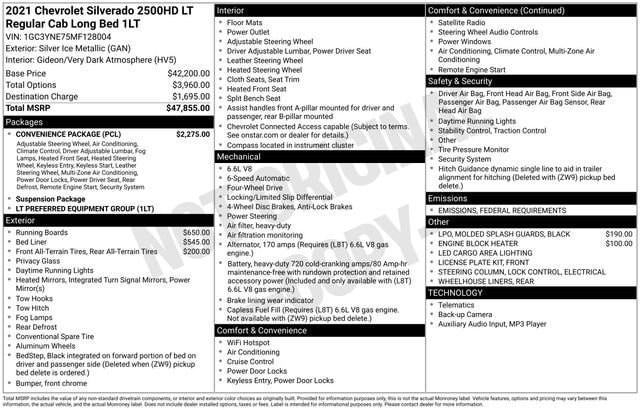 This Chevrolet Silverado 2500HD has great equipment and many features including, 10-Way Power Driver Seat Adjuster w/Lumbar, 170 Amp Alternator, 2 USB Ports (1st Row), 2-Speed Electronic Shift Transfer Case, 4-Way Manual Driver Seat Adjuster, 4.2 Diagonal Color Display DIC, 4G LTE Wi-Fi Hotspot Capable, Black Mirror Caps, Bluetooth® For Phone, Chevrolet Connected Access Capable, Chrome Front Grille, Color-Keyed Carpeting Floor Covering, Compass, Convenience Package, Deep-Tinted Glass, Dual-Zone Automatic Climate Control, Electric Rear-Window Defogger, Electrical Lock Control Steering Column, Electronic Cruise Control w/Set & Resume Speed, Front LED Fog Lamps, Front Rubberized Vinyl Floor Mats, Halogen Reflector Headlamps, Heated Driver & Front Outboard Passenger Seating, Heated Steering Wheel, Heated Vertical Trailering Mirrors, Integrated Trailer Brake Controller, Keyless Open & Start, Leather-Wrapped Steering Wheel, Manual Tailgate Function w/EZ Lift, Manual Tilt & Telescoping Steering Column, Manual Tilt-Wheel Steering Column, OnStar & Chevrolet Connected Services Capable, Power Door Locks, Power Front Windows w/Driver Express Up/Down, Power Front Windows w/Passenger Express Down, Preferred Equipment Group 1LT, Rear Vision Camera, Remote Keyless Entry, Remote Vehicle Starter System, SiriusXM Radio, Steering Wheel Audio Controls, Suspension Package, Unauthorized Entry Theft-Deterrent System, Urethane Steering Wheel.