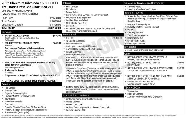 This Chevrolet Silverado 1500 LTD has great equipment and many features including, Heated Seats, Apple CarPlay, Android Auto, Remote Start, 10-Way Power Driver Seat w/Lumbar, 12-Volt Rear Auxiliary Power Outlet, 2 USB Ports (First Row), 4.2 Diagonal Color Display Driver Info Center, All-Weather Floor Liner (LPO) (AAK), Auto-Locking Rear Differential, Auxiliary External Transmission Oil Cooler, Bed Protection Package, Bluetooth® For Phone, Chevrolet Connected Access Capable, Chevytec Spray-On Black Bedliner, Cloth Rear Seat w/Storage Package, Color-Keyed Carpeting Floor Covering, Compass, Convenience Package w/Buckets Seats, Deep-Tinted Glass, Dual Exhaust w/Polished Outlets, Dual-Zone Automatic Climate Control, Electric Rear-Window Defogger, Electronic Cruise Control, EZ Lift Power Lock & Release Tailgate, Floor Mounted Center Console, Front LED Fog Lamps, Heated Driver & Front Outboard Passenger Seats, Heated Steering Wheel, Heavy-Duty Air Filter, High Gloss Black Grille, High Gloss Black Mirror Caps, Hill Descent Control, Hitch Guidance, Keyless Open & Start, Lane Change Alert w/Side Blind Zone Alert, Leather Wrapped Steering Wheel, LED Cargo Area Lighting, LED Reflector Headlamps, Manual Tilt/Telescoping Steering Column, OnStar & Chevrolet Connected Services Capable, Performance Red Recovery Hooks, Perimeter Lighting, Power Door Locks, Power Front Windows w/Driver Express Up/Down, Power Front Windows w/Passenger Express Down, Power Rear Windows w/Express Down, Preferred Equipment Group 2LT, Rear Cross Traffic Alert, Rear Dual USB Charging-Only Ports, Rear Vision Camera, Rear Wheelhouse Liners, Remote Vehicle Starter System, Safety Package, Standard Tailgate, Steering Wheel Audio Controls, Suspension Package, Theft Deterrent System (Unauthorized Entry), Trailering Package, Ultrasonic Front & Rear Park Assist, Wi-Fi Hot Spot Capable.