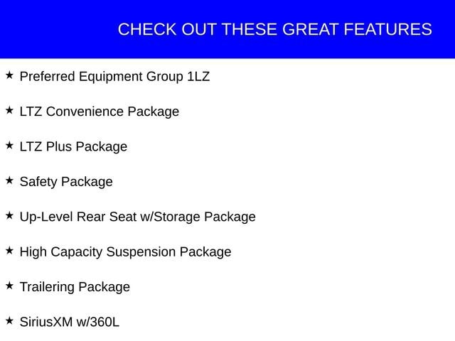 This Chevrolet Silverado 1500 has great equipment and many features including, 10-Way Power Driver Seat w/Lumbar, 10-Way Power Passenger Seat Adjuster w/Lumbar, 12.3 Multicolor Reconfigurable Digital Display, 120-Volt Bed Mounted Power Outlet, 120-Volt Instrument Panel Power Outlet, 2 USB Data Ports, Auto-Dimming Inside Rear-View Mirror, Auto-Locking Rear Differential, Bluetooth® For Phone, Chevrolet Connected Access Capable, Chrome Mirror Caps, Color-Keyed Carpeting Floor Covering, Compass, Deep-Tinted Glass, Driver Memory, Dual Rear USB Ports (Charge Only), Electric Rear-Window Defogger, Electrical Steering Column Lock, Electronic Cruise Control, Floor Mounted Center Console, Front Frame-Mounted Black Recovery Hooks, Front LED Fog Lamps, Front Rainsensing Wipers, Front Rubberized Vinyl Floor Mats, HD Surround Vision, Heated Driver & Front Outboard Passenger Seats, Heated Steering Wheel, High Capacity Suspension Package, Hitch Guidance, Hitch Guidance w/Hitch View, Integrated Trailer Brake Controller, Keyless Open & Start, LED Cargo Area Lighting, LTZ Convenience Package, LTZ Plus Package, OnStar & Chevrolet Connected Services Capable, Outside Heated Power-Adjustable Mirrors, Perimeter Lighting, Power Front Passenger Windows w/Express Up/Down, Power Front Windows w/Driver Express Up/Down, Power Rear Windows w/Express Down, Power Tailgate, Power Tilt & Telescoping Steering Column, Preferred Equipment Group 1LZ, Premium Bose 7-Speaker Sound System, Rear Cross Traffic Alert-Braking, Rear Pedestrian Alert, Rear Rubberized-Vinyl Floor Mats, Rear Wheelhouse Liners, Remote Vehicle Starter System, Safety Alert Seat, Safety Package, SiriusXM w/360L, Standard Tailgate, Steering Wheel Audio Controls, Theft Deterrent System (Unauthorized Entry), Trailer Camera Provisions, Trailer Side Blind Zone Alert, Trailering App, Trailering Package, Ultrasonic Front & Rear Park Assist, Up-Level Rear Seat w/Storage Package, Ventilated Driver & Front Passenger Seats, Wi-Fi Hot Spot Capable, Wireless Charging, Wireless Phone Projection, Wrapped Steering Wheel.