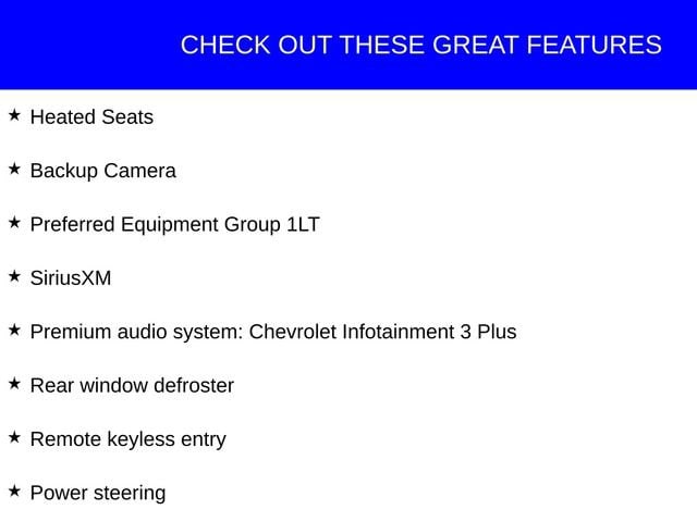 This Chevrolet Malibu has great equipment and many features including, Heated Seats, Backup Camera, 17 Aluminum Wheels, Delay-off headlights, Fully automatic headlights, Power steering, Power windows, Preferred Equipment Group 1LT, Premium audio system: Chevrolet Infotainment 3 Plus, Rear window defroster, Remote keyless entry, SiriusXM, Steering wheel mounted audio controls.