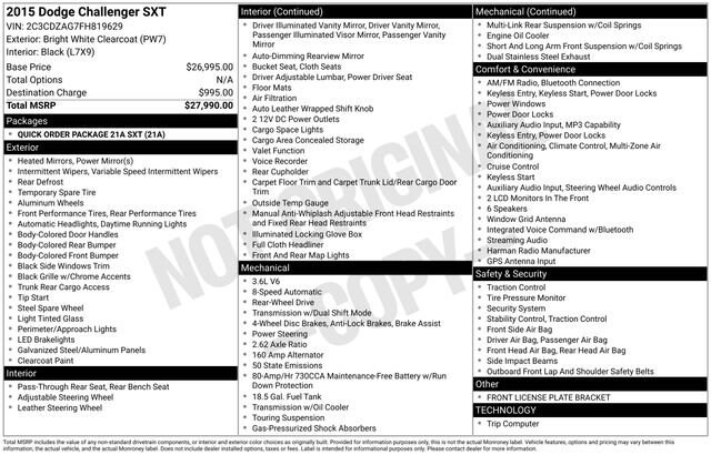 Equipped with a robust 3.6L V6 24V VVT engine and an 8-Speed Automatic transmission, this Challenger delivers an exceptional blend of performance and efficiency, with an impressive 19 city/30 highway MPG rating. The vehicle's Quick Order Package 21A SXT further enhances its capabilities, offering a wealth of premium amenities that cater to your every need.