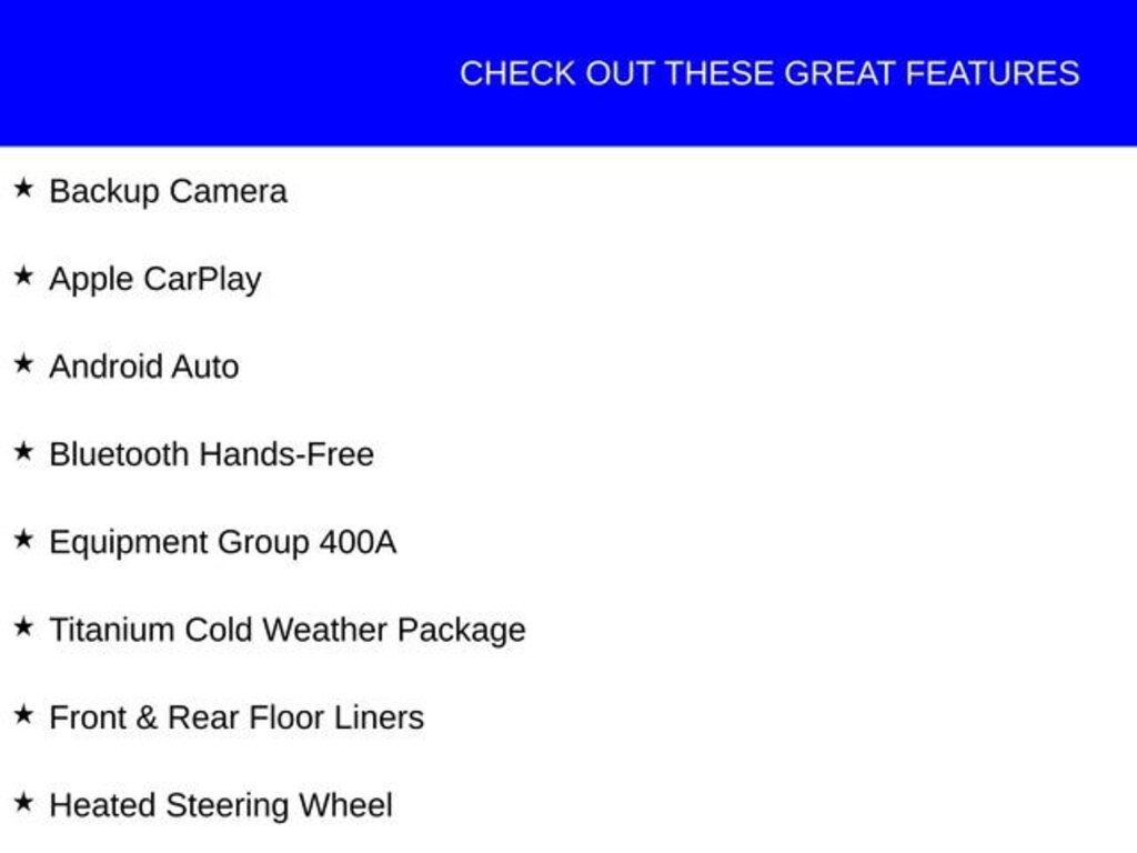 This Ford EcoSport has great equipment and many features including, Backup Camera, Apple CarPlay, Android Auto, Bluetooth Hands-Free, Equipment Group 400A, Front & Rear Floor Liners, Heated Steering Wheel, SYNC Connect, Titanium Cold Weather Package, Windshield Wiper De-Icer.