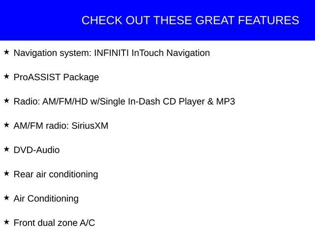 This INFINITI QX80 has great equipment and many features including, Air Conditioning, AM/FM radio: SiriusXM, Anti-whiplash front head restraints, Blind Spot Intervention (BSI), Dual front side impact airbags, DVD-Audio, Front Center Armrest, Front dual zone A/C, Intelligent Cruise Control, Lane Departure Prevention (LDP), Navigation system: INFINITI InTouch Navigation, Occupant sensing airbag, Power passenger seat, Power steering, ProASSIST Package, Radio: AM/FM/HD w/Single In-Dash CD Player & MP3, Rear air conditioning, Remote keyless entry, Smart Rear View Mirror, Telescoping steering wheel.