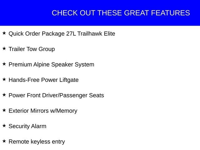 This Jeep Cherokee has great equipment and many features including, 7 & 4 Pin Wiring Harness, 8.4 Touchscreen Display, Apple CarPlay/Android Auto, Auto-Dimming Rear-View Mirror, Class III Receiver Hitch, Delay-off headlights, Exterior Mirrors Courtesy Lamps, Exterior Mirrors w/Memory, Fully automatic headlights, Hands-Free Power Liftgate, Heated door mirrors, Heated Front Seats, Heated Steering Wheel, Hill Descent Control, Leather Wrapped Steering Wheel, Power door mirrors, Power Front Driver/Passenger Seats, Power Front/Fixed Rear Full Sunroof, Premium Alpine Speaker System, Premium Leather Trimmed Bucket Seats, Quick Order Package 27L Trailhawk Elite, Radio/Driver Seat/Exterior Mirrors Memory, Remote keyless entry, Remote Start System, Security Alarm, Tonneau Cover, Trailer Tow Group, Trailer Tow Wiring Harness, Ventilated Front Seats, Windshield Wiper De-Icer.