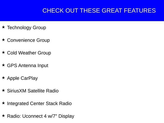 This Jeep Wrangler has great equipment and many features including, 1-Year SiriusXM Radio Service, 7.0 Touchscreen Display, Air Conditioning w/Auto Temperature Control, Air Filtering, Apple CarPlay, Cluster 7.0 TFT Color Display, Cold Weather Group, Convenience Group, Google Android Auto, GPS Antenna Input, Heated Front Seats, Heated Steering Wheel, Integrated Center Stack Radio, Non-Lock Fuel Cap w/o Discriminator, Premium Black Sunrider Soft Top, Radio: Uconnect 4 w/7 Display, SiriusXM Satellite Radio, Technology Group, Universal Garage Door Opener, USB Host Flip.