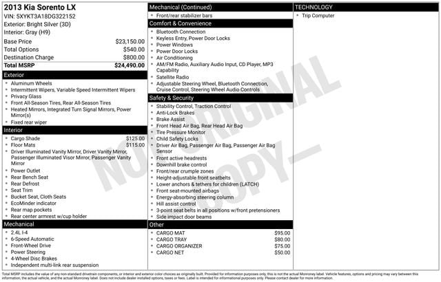 Bright Silver 2013 Kia Sorento LX FWD 4D Sport Utility 2.4L I4 MPI DOHC Dual CVVT 21/30 City/Highway MPG
