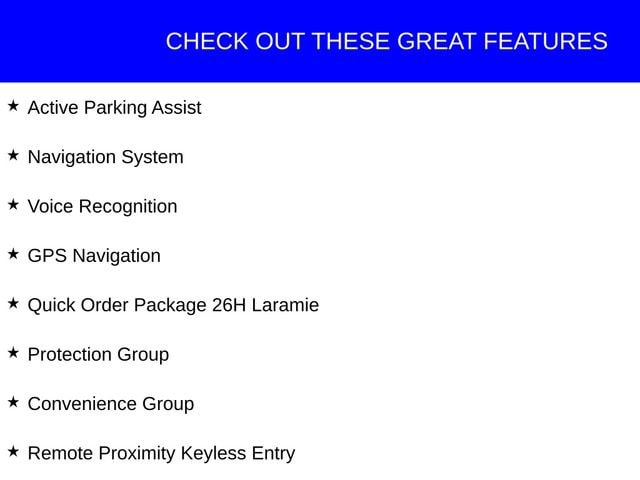 This Ram 1500 has great equipment and many features including, Active Parking Assist, Navigation System, Voice Recognition, Auto High Beam Headlamp Control, Convenience Group, Electronic Stability Control, GPS Navigation, Keyless Enter-N-Go, ParkView Rear Back-Up Camera, Protection Group, Quick Order Package 26H Laramie, Rain Sensitive Windshield Wipers, Remote Proximity Keyless Entry, Tow Hooks.