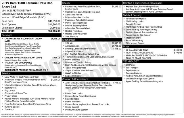 Ivory White Tri-Coat Pearlcoat 2019 Ram 1500 Laramie 4WD 4D Crew Cab HEMI 5.7L V8 Multi Displacement VVT