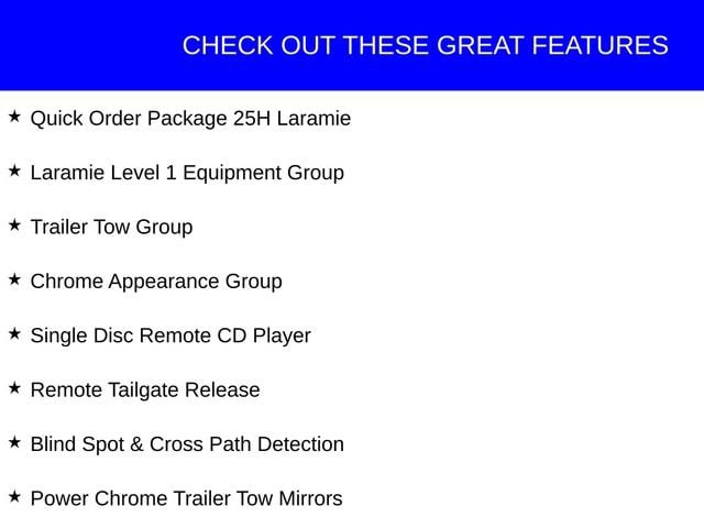This Ram 1500 has great equipment and many features including, Auto High Beam Headlamp Control, Blind Spot & Cross Path Detection, Bright Day Light Opening Moldings, Chrome Appearance Group, Chrome Tow Hooks, Foam Bottle Insert (Door Trim Panel), Laramie Level 1 Equipment Group, ParkSense Front/Rear Park Assist w/Stop, Power Chrome Trailer Tow Mirrors, Quick Order Package 25H Laramie, Rain Sensitive Windshield Wipers, Rear 60/40 Folding Split Recline Seat, Remote Tailgate Release, Single Disc Remote CD Player, Tailgate Ajar Warning Lamp, Trailer Brake Control, Trailer Tow Group, Trailer Tow Mirrors, Wheel to Wheel Side Steps.