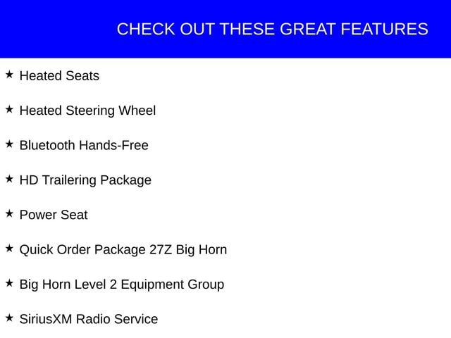 This Ram 1500 has great equipment and many features including, Heated Seats, Heated Steering Wheel, Bluetooth Hands-Free, HD Trailering Package, Power Seat, 115V Auxiliary Power Outlet, 115V Auxiliary Rear Power Outlet, 2nd Row In Floor Storage Bins, 6 Speakers, Air Conditioning ATC w/Dual Zone Control, Auto-Dimming Exterior Driver Mirror, Auto-Dimming Rear-View Mirror, Big Horn Badge, Big Horn Level 2 Equipment Group, Black Premium Power Mirrors, Class IV Receiver Hitch, Cluster 7.0 TFT Color Display, Exterior Mirrors Courtesy Lamps, Exterior Mirrors w/Supplemental Signals, Foam Bottle Insert (Door Trim Panel), For More Info, Call 800-643-2112, Glove Box Lamp, Heated Front Seats, Heated Steering Wheel, Media Hub w/2 Charge Only USBs, ParkSense Front/Rear Park Assist w/Stop, Power 4-Way Driver Lumbar Adjust, Power 8-Way Driver Seat, Power Adjustable Pedals, Power-Folding Mirrors, Quick Order Package 27Z Big Horn, Rear Dome w/On/Off Switch Lamp, Rear Power Sliding Window, Rear Window Defroster, Security Alarm, SiriusXM Radio Service, Sun Visors w/Illuminated Vanity Mirrors, Universal Garage Door Opener.